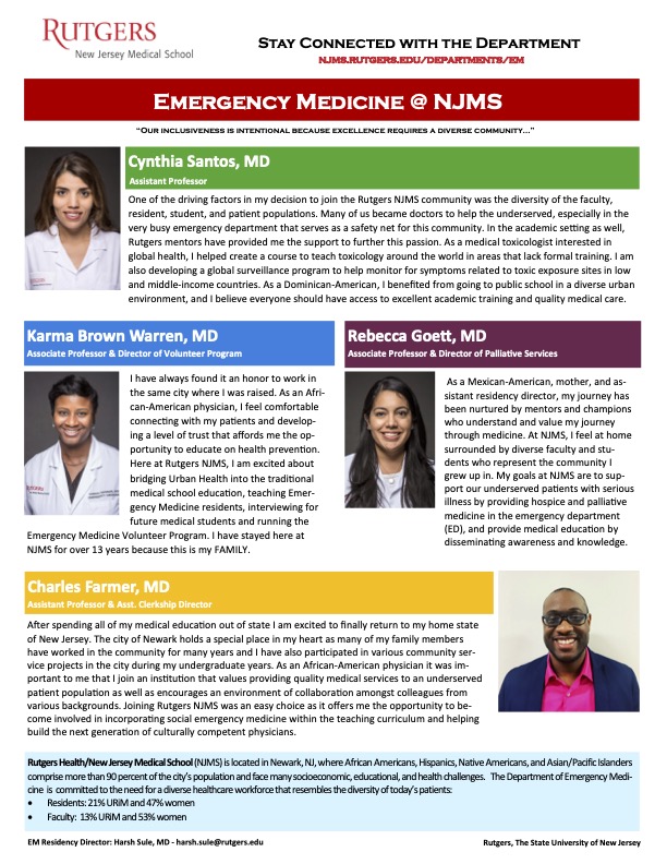 Rutgers NJMS has a tradition of commitment to diversity and has fostered a spirit of inclusiveness for its highly diverse community, faculty, staff, and students. Our mission is to develop individuals underrepresented in medicine and other health professions, as well as to champion cultural awareness, community service, and humanism in all aspects of medical education. We at NJMS are resolutely responding to the need for a diverse healthcare workforce that resembles the diversity of today’s patients. For further details of institutional efforts related to diversity please visit our Office for Diversity & Community Engagement.