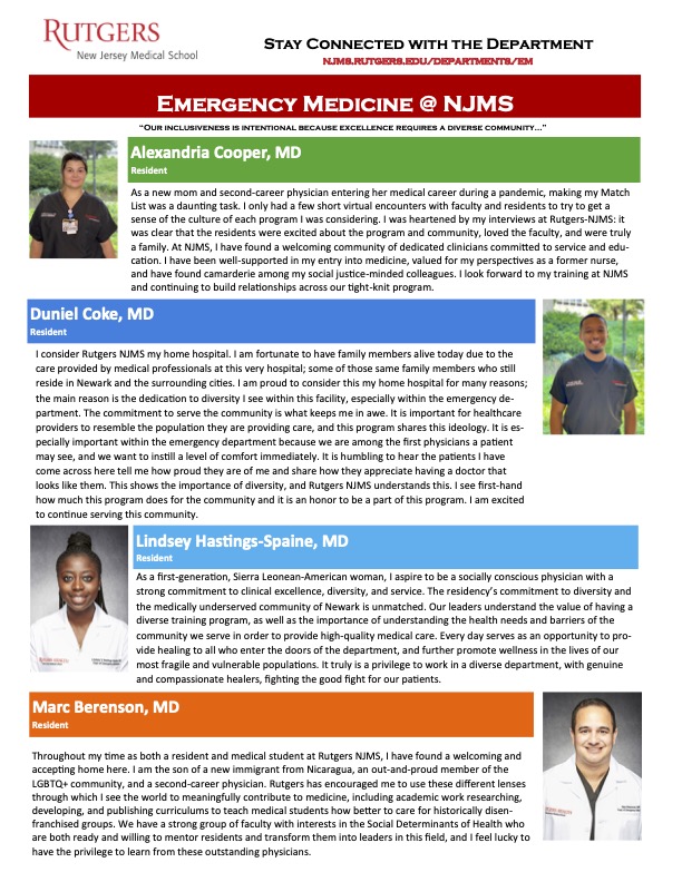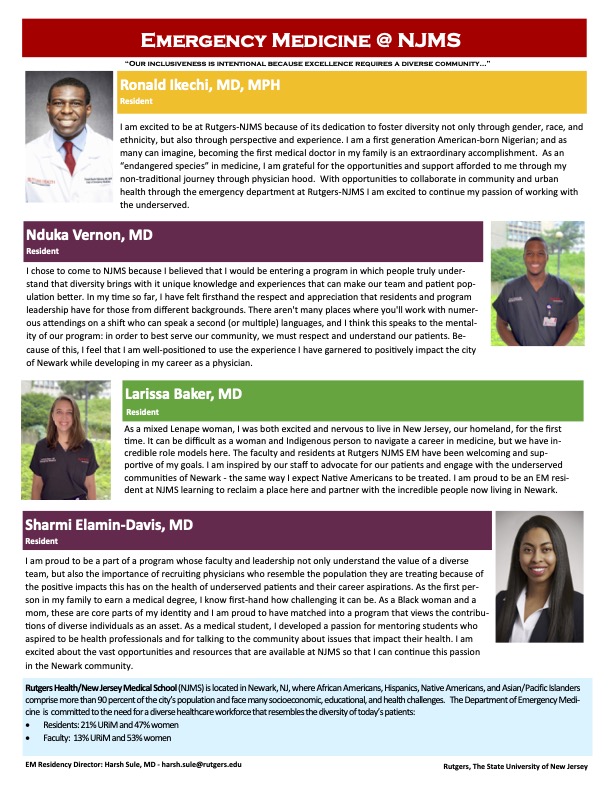 Visiting sub-Internship Program for Underrepresented in Medicine (VIP-UiM): At Rutgers Health/NJMS and University Hospital Newark, our goal is develop individuals underrepresented in medicine (UiM), as well as to champion cultural competency, community service, and humanism in all aspects of medical education. We specifically aim to foster the education and inclusion of physicians from groups represented in our patient base, which is over 50% African American, over 35% Hispanic, with many Spanish-speakers and a significant portion - approximately 8 percent - Portuguese speaking. To that end, we have implemented a program to specifically support the needs and growth of students from groups that have traditionally been underrepresented in medicine. Further details on this program can be found by clicking here.