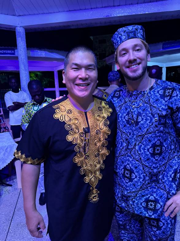 Edward Lee, PD and Chris Didzbalis, resident, at the joint dinner between the volunteer team and hospital staff in traditional West African attire. Ghana, September 2024.