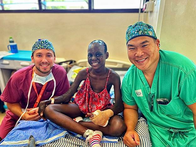 Chris Didzbalis, resident, and Ed Lee (PD) with a young patient after burn scar contracture release and reconstruction. Ghana September 2024.
