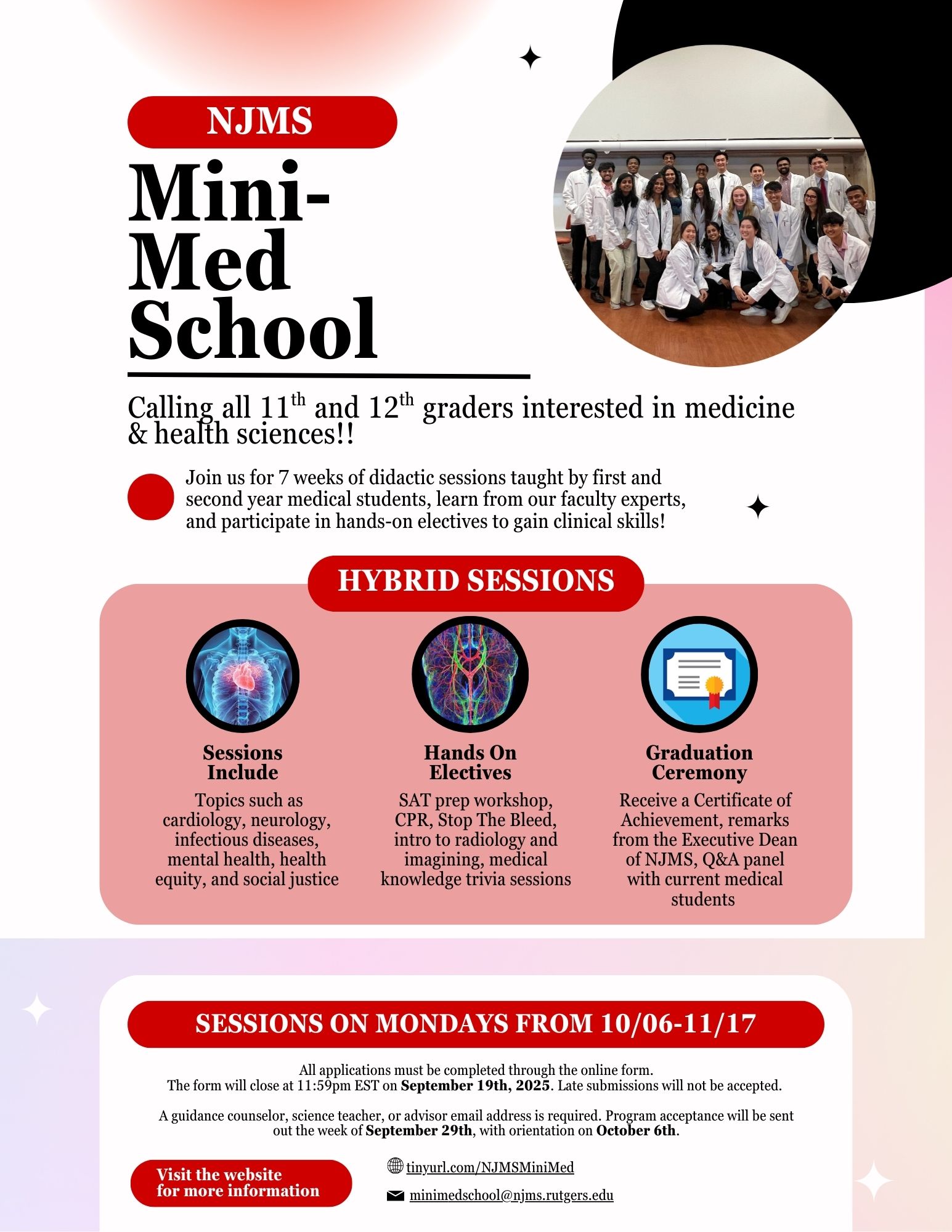 The Mini-Med School at NJMS is a 6-week educational program designed to inspire high school juniors and seniors in the greater Newark area to explore careers in medicine and the health sciences. Through weekly didactic sessions led by first and second-year medical students, followed by lectures from faculty experts, students gain exposure to a range of medical topics including cardiology, neurology, infectious diseases, mental health, health equity, and social justice. The program also features hands-on electives, offering students practical experience in clinical skills. Participants who attend all six academic sessions are honored on Graduation Day (week six) with a Certificate of Achievement. The event includes remarks from the Executive Vice Dean of NJMS, as well as a Q&A panel with current medical students, providing valuable insight into the medical school journey.